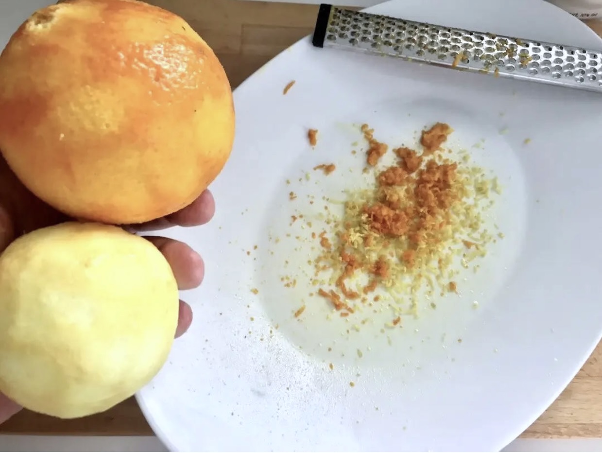 Przygotowanie cytrusów: Zetrzyj skórkę z pomarańczy i cytryny (jeśli nie są BIO, najpierw je umyj lub wyparz gorącą wodą). Następnie wyciśnij sok z owoców.