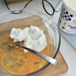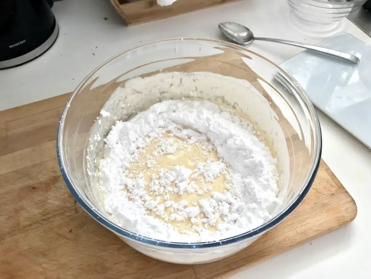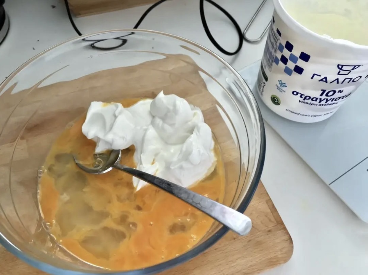 Mieszanie składników mokrych: Do miski wbij jajka, dodaj jogurt grecki i wymieszaj na jednolitą masę. Dodaj cukier puder i ponownie zamieszaj.