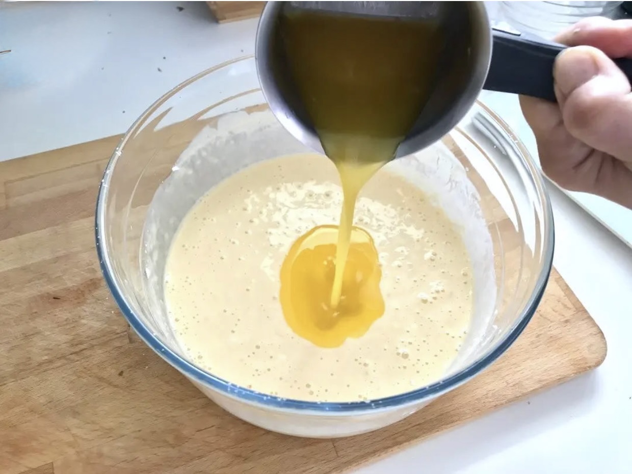 Dodawanie masła i skórek: Wlej do ciasta roztopione i przestudzone masło, dodaj starte skórki z cytrusów i wymieszaj.