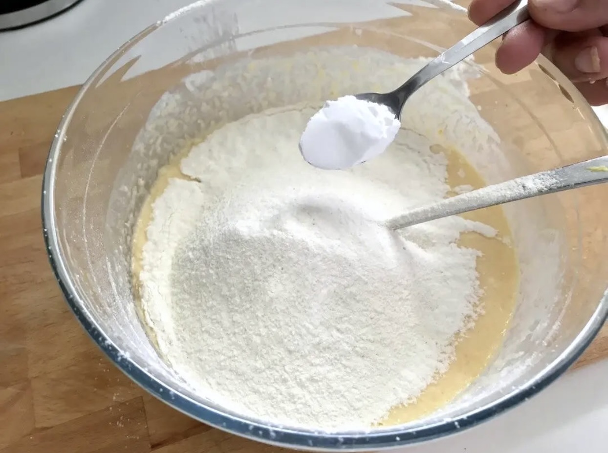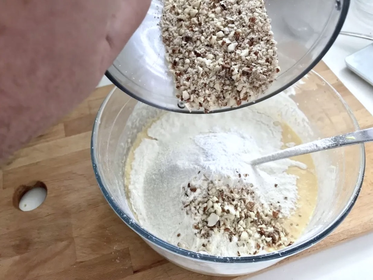 Dodawanie mąki i migdałów: Wsyp do miski mąkę oraz proszek do pieczenia, a następnie dobrze wymieszaj ciasto. Migdały rozdrobnij metodą pulsacyjną w malakserze, dodaj do ciasta i dobrze wymieszaj całość.