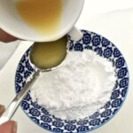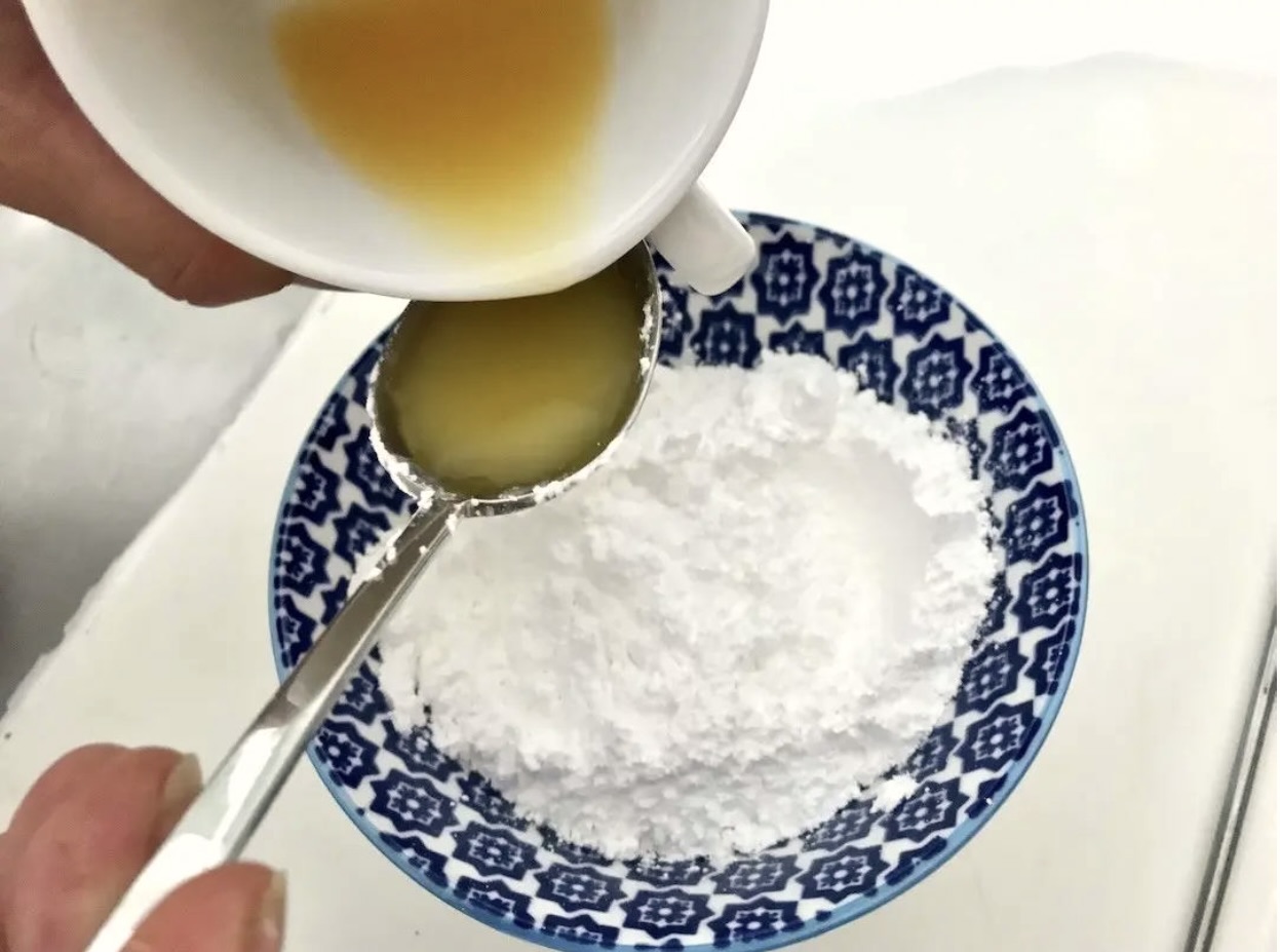 Przygotowanie lukru: Do małej miski wsyp 150 g cukru pudru, a następnie wlej 3 łyżki wcześniej wyciśniętego soku z cytrusów. Mieszaj, aż uzyskasz gęsty lukier.