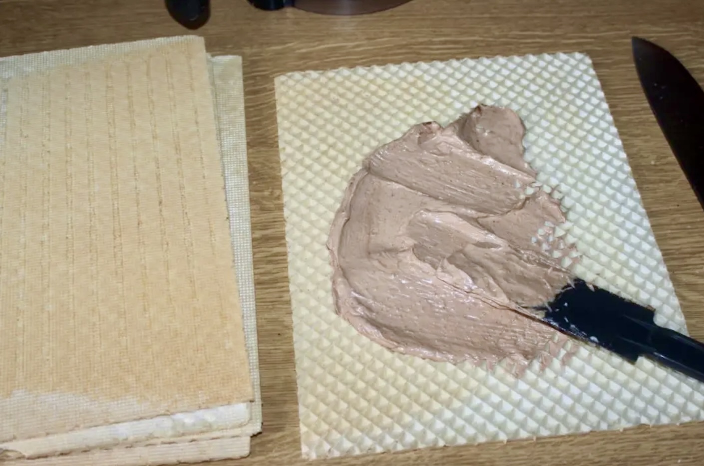 Składanie tortu: Na wierzchu pierwszego andruta równomiernie rozsmaruj część masy. Przykryj drugim andrutem i dobrze dociśnij. Powtarzaj czynność do momentu wykorzystania całej masy i andrutów.