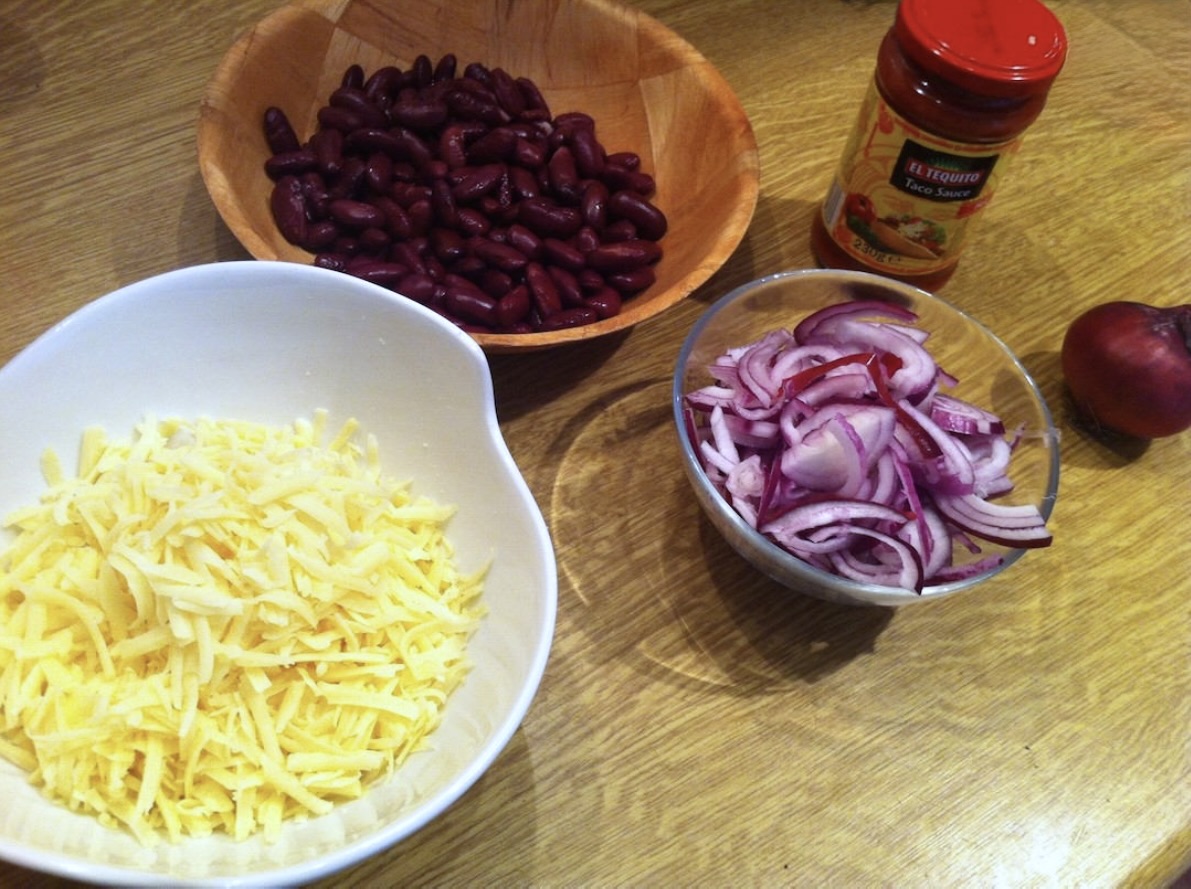 Warzywa: 1 puszka czerwonej fasoli (przepłukanej), mała puszka kukurydzy (opcjonalnie), 1 cebula, 2 ząbki czosnku.