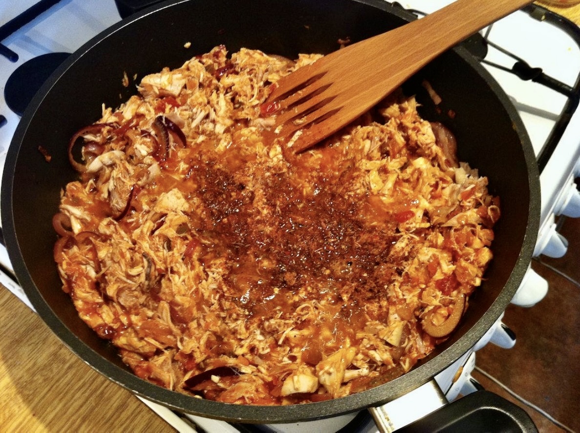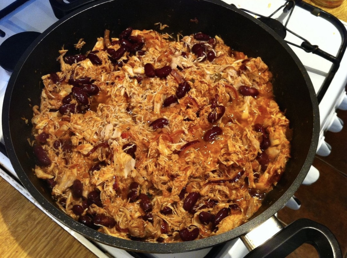 Tortilla z kurczakiem to fantastyczne danie, które najlepiej jest przygotować, gdy w zanadrzu masz już ugotowanego kurczaka. Jeśli tak jest to przygotowanie tego dania jest łatwe i szybkie. Możesz jednak po prostu ugotować rosół na niedzielę, a na drugi dzień obiadem może być właśnie tortilla z kurczakiem z tegoż rosołu. Zastosowanie gotowanego mięsa z kurczaka znakomicie podnosi walory smakowe tego dania zwłaszcza, gdy to mięso doprawisz swoją ulubioną mieszanką przypraw meksykańskich.