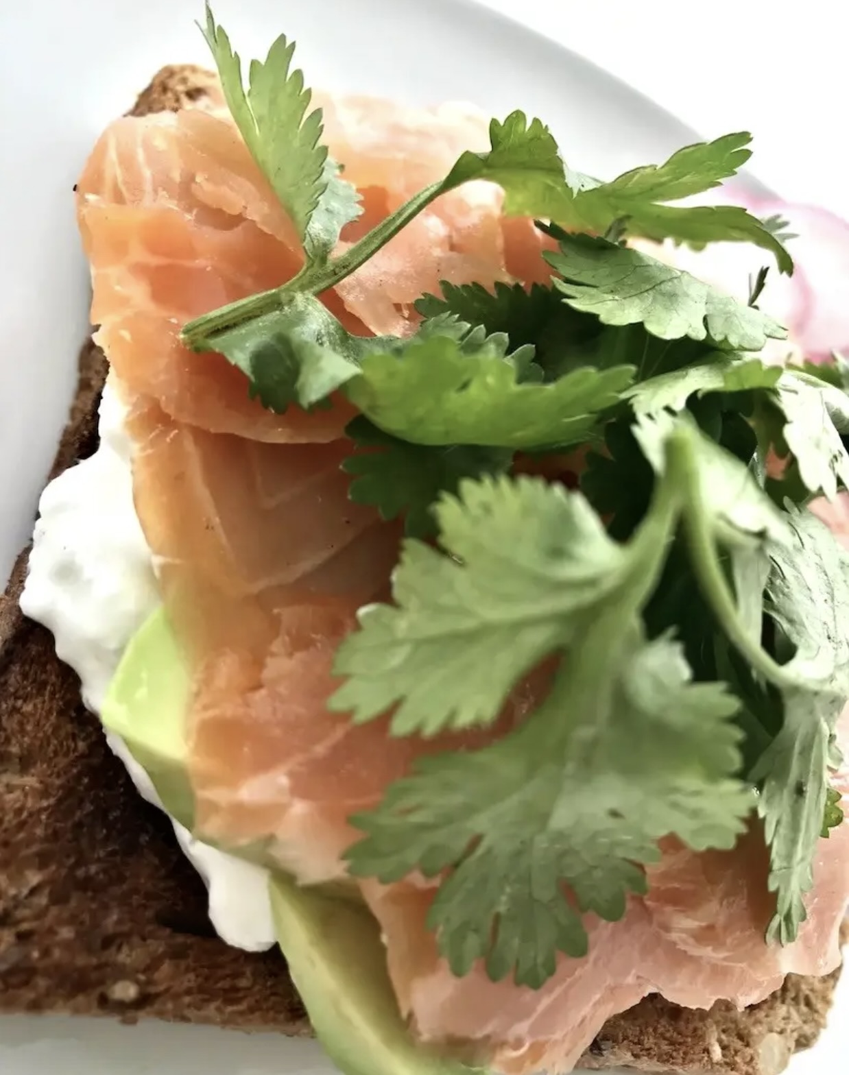 Tosty z łososiem podawaj od razu po przygotowaniu, ozdobione sporą ilością listków świeżej kolendry do smaku.