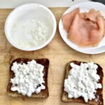 Opieczone kromki chleba obłóż serkiem według uznania.