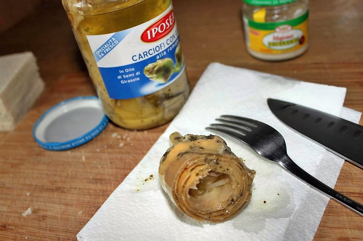 Masa z karczochów: Karczochy pokrój w drobne plasterki lub kawałki. Wymieszaj je z niewielką ilością majonezu (lub serka), by składniki się połączyły.