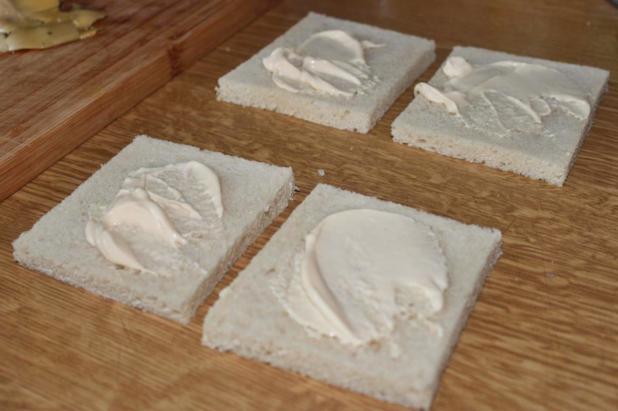 Przygotowanie pieczywa: Jeśli używasz zwykłego chleba tostowego, odetnij z niego skórki. Kromki powinny być miękkie i elastyczne.