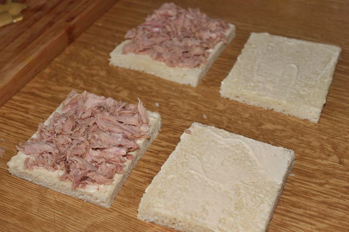 Masa z tuńczyka: W miseczce wymieszaj rozdrobnionego tuńczyka z majonezem, tak aby powstała gęsta pasta. Dopraw solą i dużą ilością świeżo mielonego pieprzu. Możesz dodać posiekane kapary.
