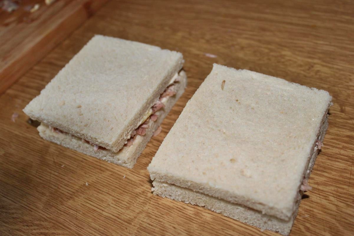 Formowanie: Przykryj całość ostatnią kromką chleba. Kanapkę lekko dociśnij dłonią, aby warstwy się scaliły.