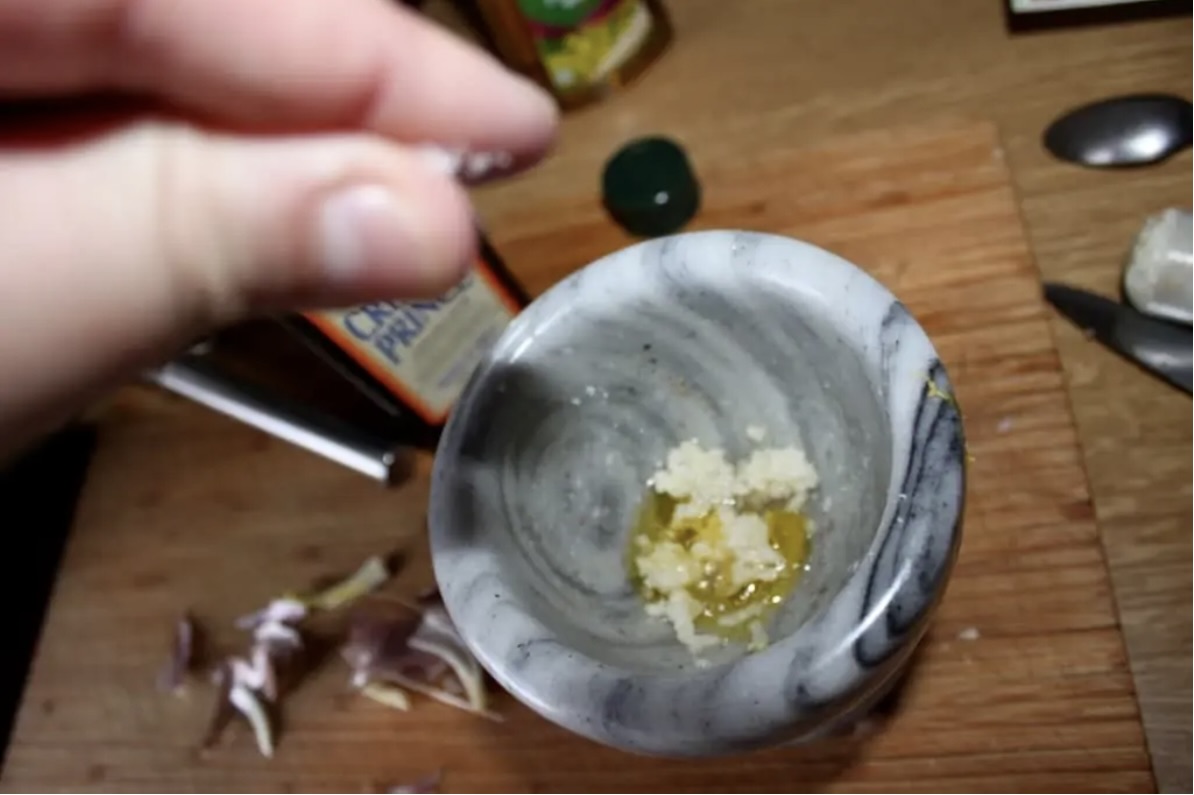 Pasta czosnkowa: W moździerzu utrzyj obrany ząbek czosnku z 2 łyżeczkami oliwy, 2 łyżeczkami białego octu winnego i szczyptą soli na gładką masę.