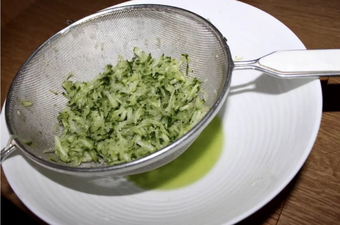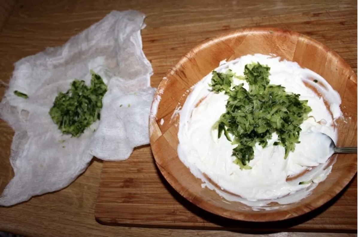 Przygotowanie ogórka: Ogórka umyj i zetrzyj na tarce (grube lub drobne oczka, według uznania). Przełóż na sito, posól i odstaw na pół godziny, aby puścił wodę.