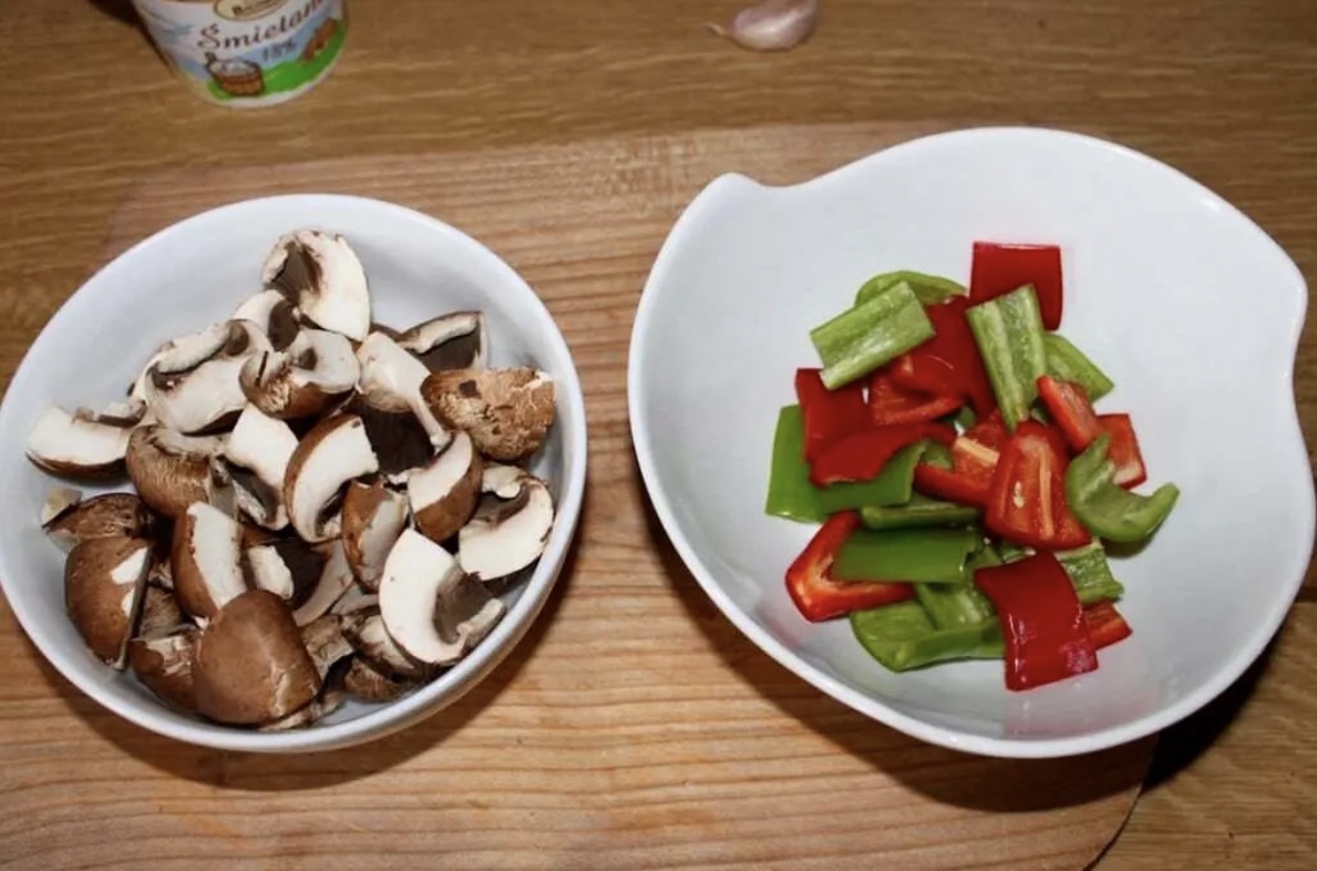 W dużej misce wymieszaj pokrojone kapelusze pieczarek i papryki, obrane ząbki czosnku oraz 1-2 łyżki oliwy.