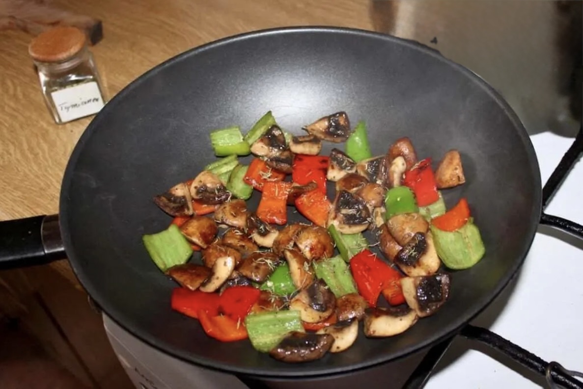 Gdy warzywa lekko zmiękną i zrumienią się, dodaj łyżeczkę suszonego tymianku.