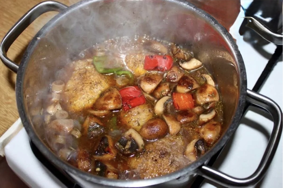Dolej wrzącej wody, aby przykryła mięso, i dodaj pokrojone nóżki pieczarek.