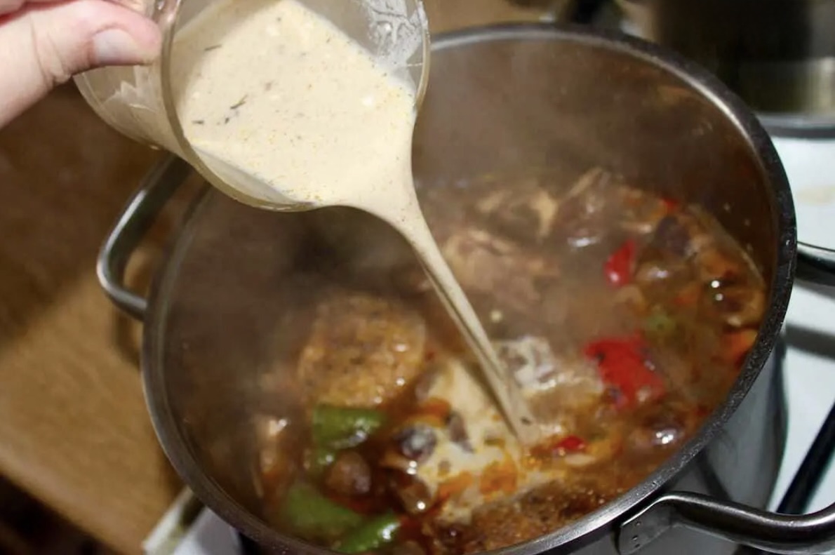 Dodaj 1-2 łyżki kwaśnej śmietany, zahartuj sosem z garnka i wlej do całości.