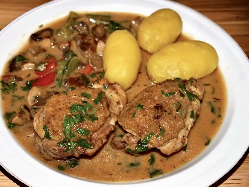 Udka z kurczaka duszone smakują świetnie z gotowanymi ziemniakami.