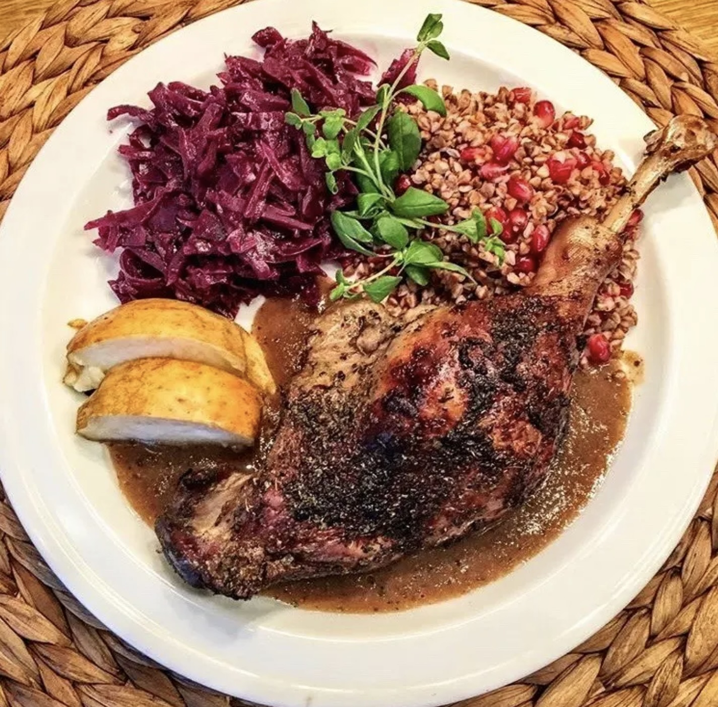 Podawaj na sosie z pieczonych jabłek winnych, z kaszą gryczaną z pestkami granatu, modrą kapustą i dodatkowo kawałkami pieczonych jabłek winnych.