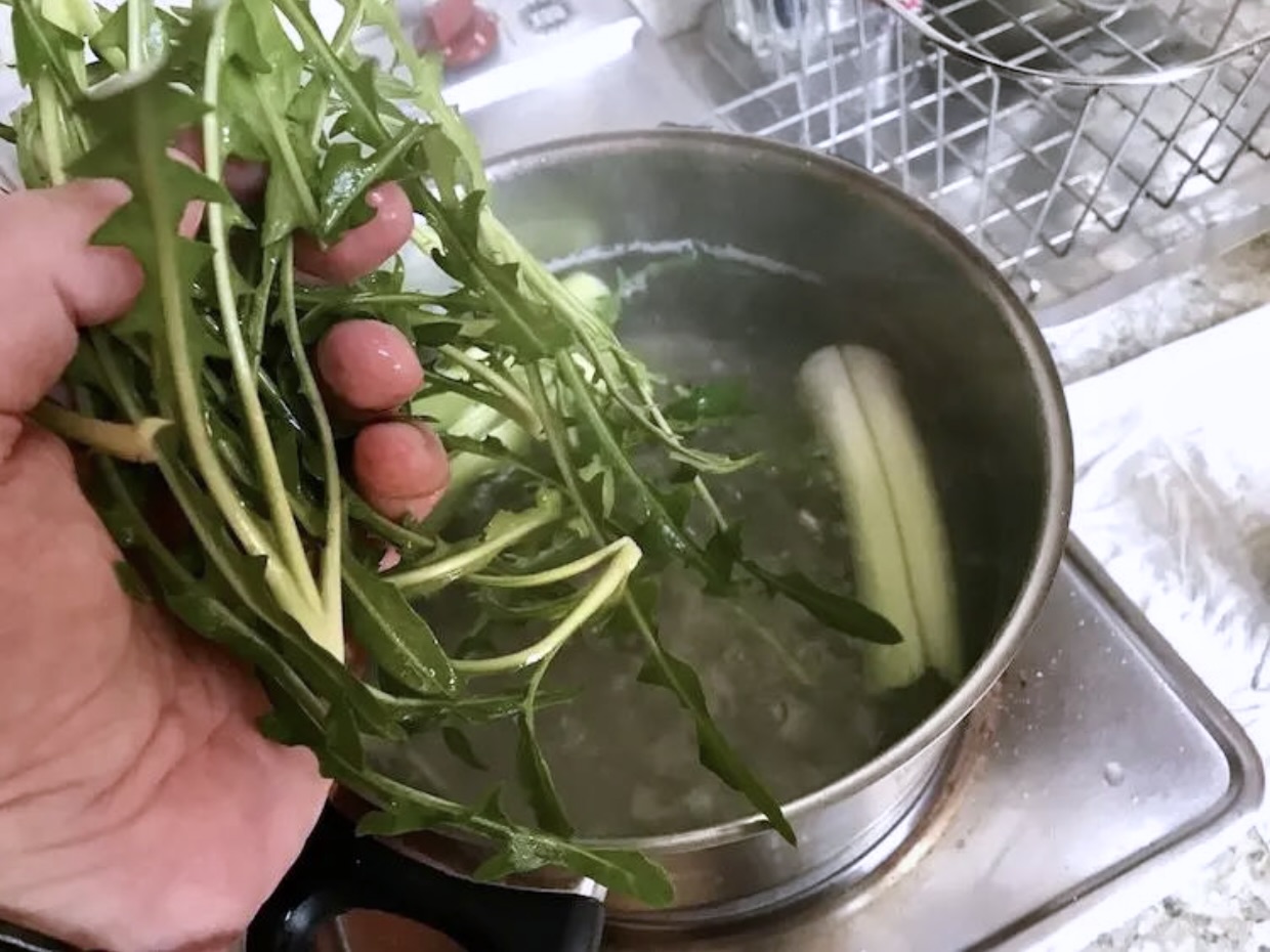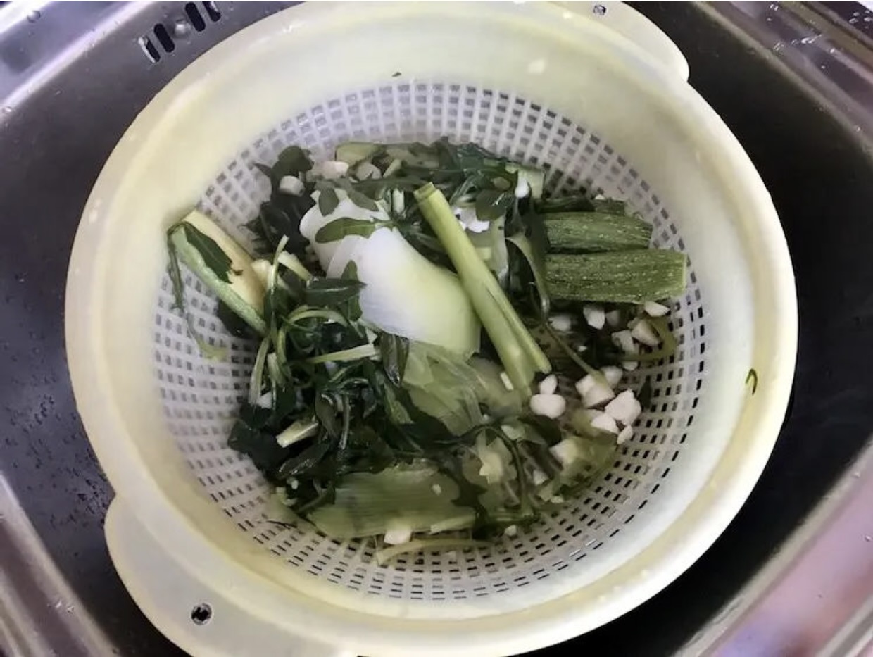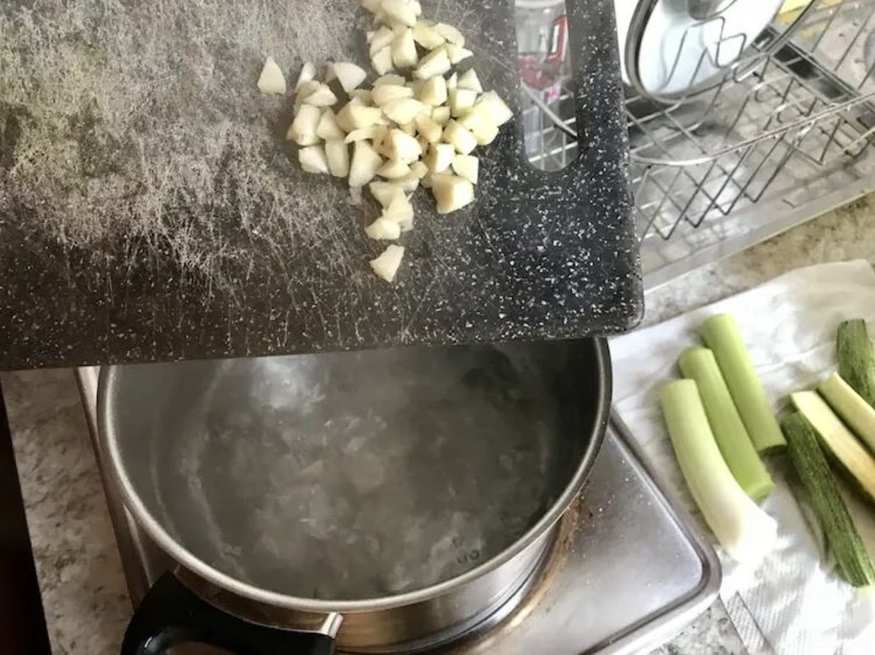 W pierwszej kolejności wrzuć czosnek, pora oraz cykorię/szpinak.