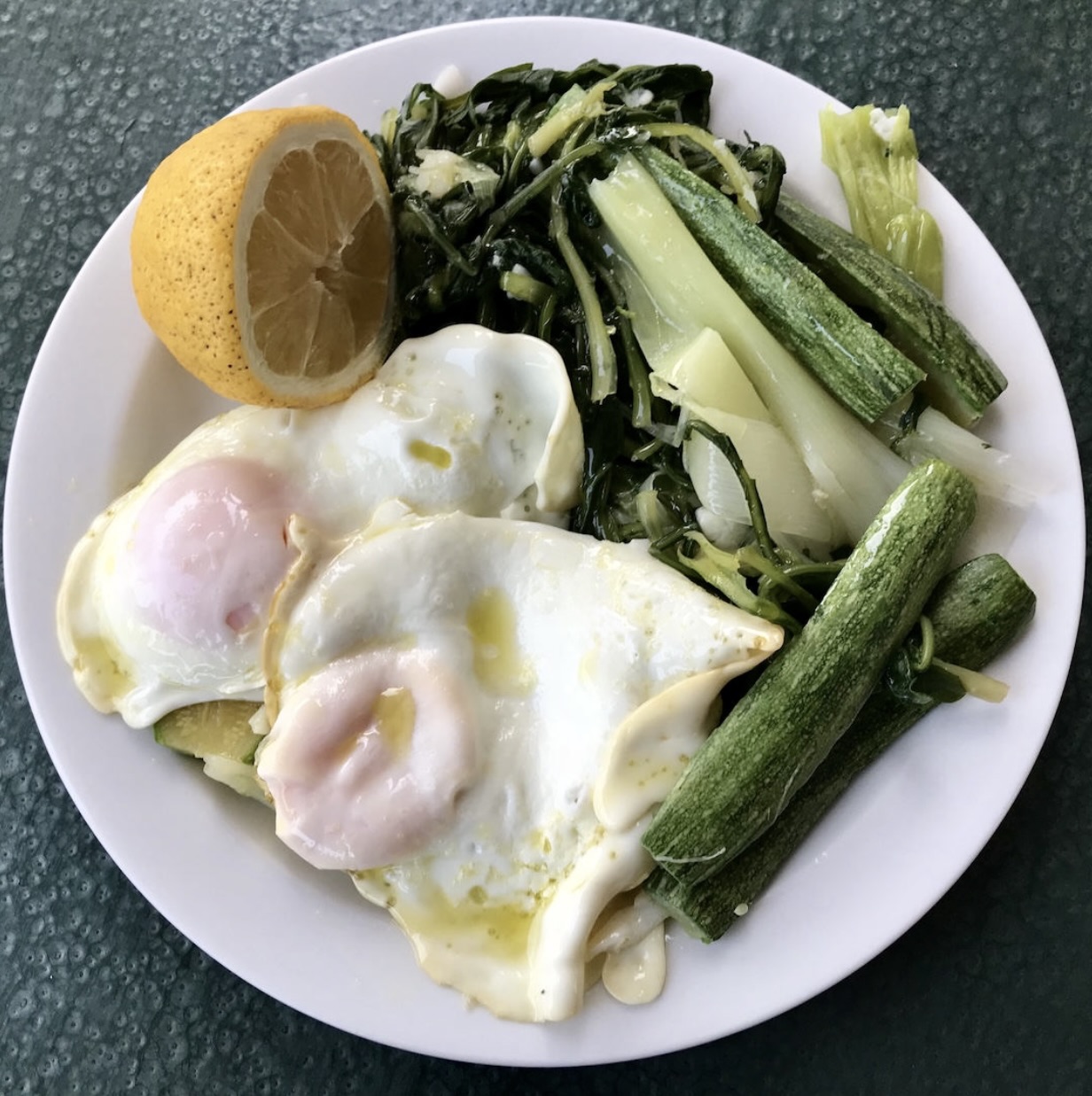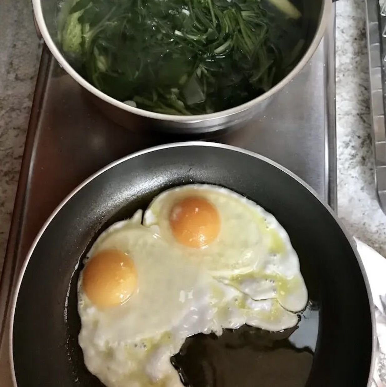 W czasie, gdy warzywa się gotują, usmaż na patelni dwa jajka sadzone (używając oliwy z oliwek).