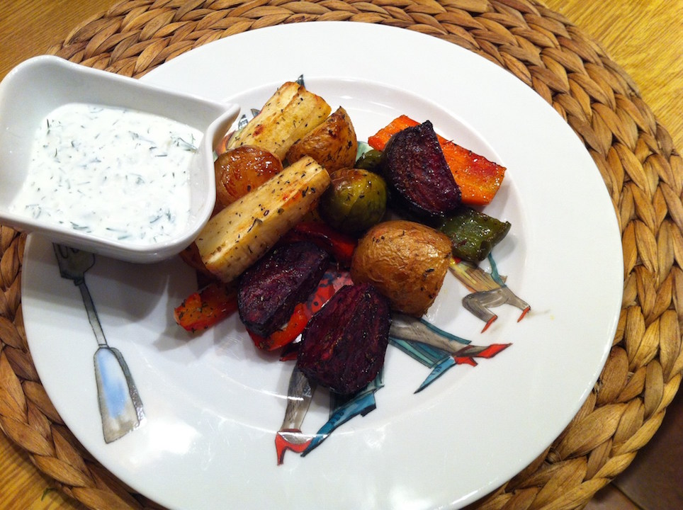 Blachę z warzywami pieczonymi wyłóż na stół. Obok postaw dip koperkowy i (zobacz przepis na ziemniaki z łososiem). Pora zwołać współbiesiadników. Zajadajcie prosto z blachy lub serwujcie na talerzu razem z dipem koperkowym.