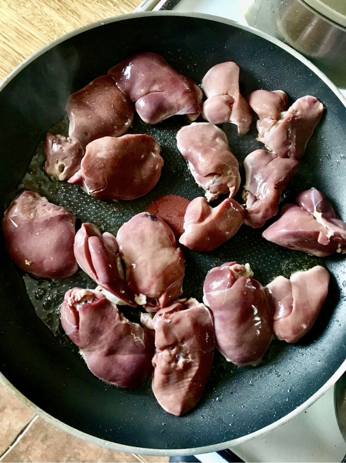 Smażenie wątróbki: Rozgrzej dobrze patelnię z niewielką ilością oleju. Wrzuć wątróbkę. Po ok. 30 sekundach zmniejsz ogień i smaż przez 4-5 minut, od czasu do czasu obracając, aż się zarumieni.