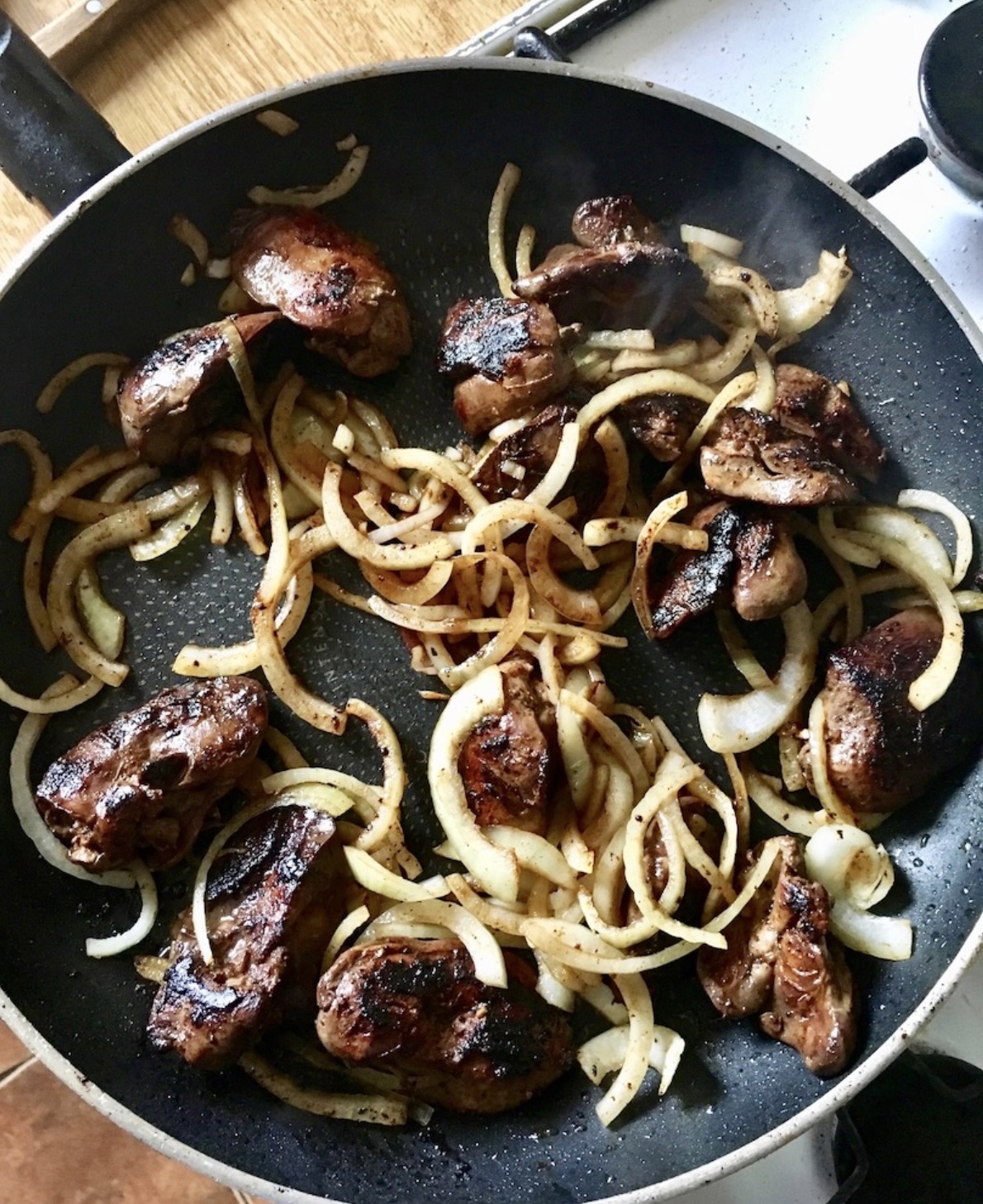 Wskazówka: Sprawdź stopień wysmażenia, przekrawając jedną wątróbkę. Całkowity czas smażenia nie powinien przekroczyć 10 minut. Jeśli wątróbka jest gotowa, a cebula jeszcze nie – zdejmij mięso i dosmaż samą cebulę.