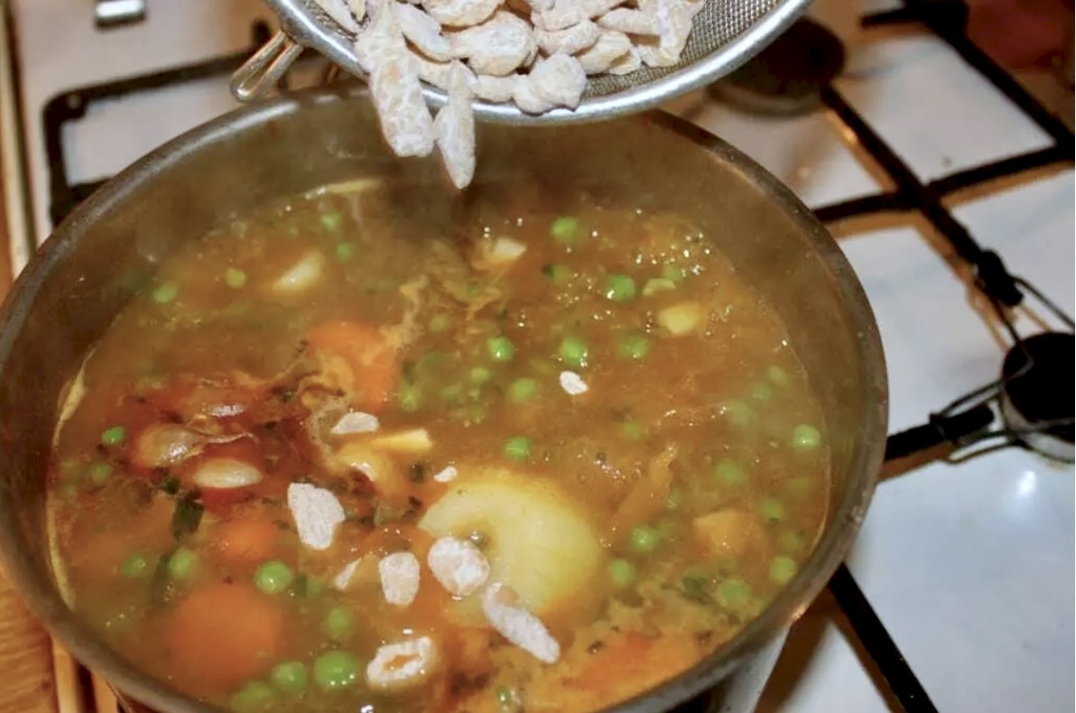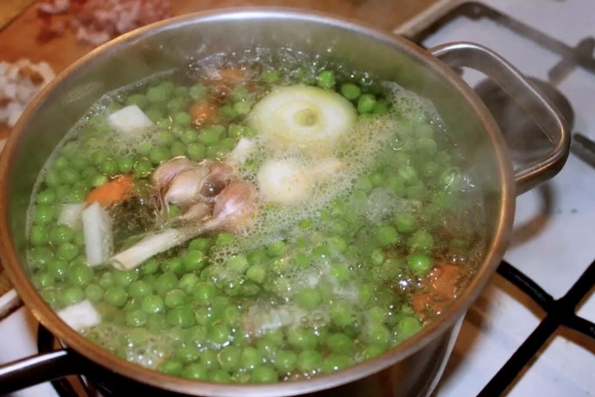 Gotowanie bazy: Obierz marchewkę, pietruszkę i seler, a następnie pokrój je w kostkę lub plasterki. Przełóż warzywa korzeniowe do garnka, dodaj mrożony groszek, całą cebulę oraz całą główkę czosnku. Zalej całość ok. 1,5 litra zimnej wody, dodaj łyżeczkę soli i zagotuj. Gotuj pod przykryciem na małym ogniu przez około 15 minut (aż warzywa zmiękną).