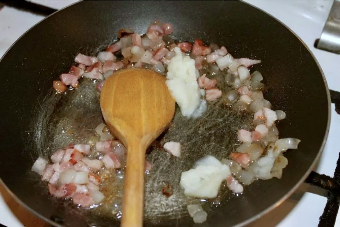 Zasmażka: Na małej patelni wytop pokrojony w kostkę boczek lub słoninę ze smalcem. Gdy powstaną skwarki, zdejmij je z patelni, a następnie odłóż na bok. Na wytopiony tłuszcz wsyp 2 łyżki mąki i mieszaj, aż powstanie jasna zasmażka.