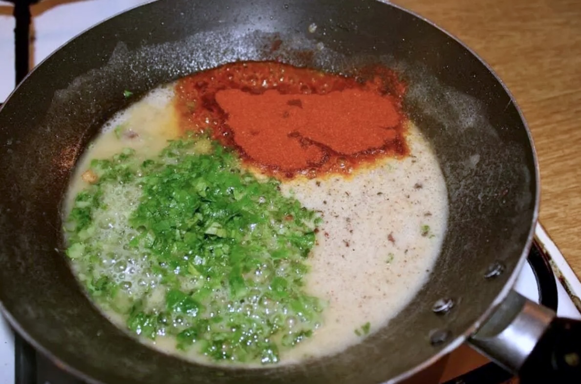 Łączenie składników: Zdejmij patelnię z ognia, dodaj garść posiekanej natki pietruszki oraz 2 kopiaste łyżeczki słodkiej mielonej papryki. Wymieszaj dokładnie, by nie było grudek. Wlej zasmażkę do gotującej się zupy, cały czas mieszając.