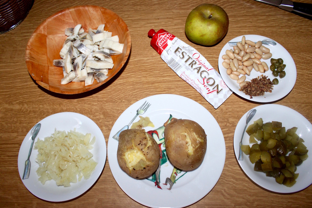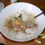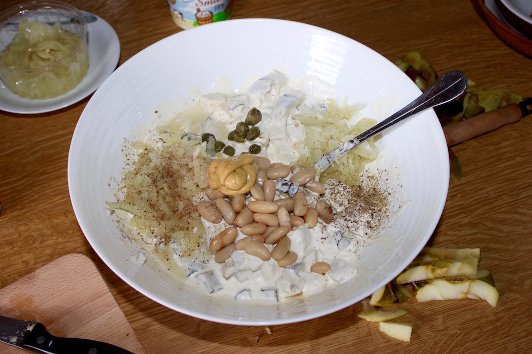 Przygotowanie sosu i mieszanie: Do dużej miski włóż gęstą śmietanę, majonez i posiekane anchois (lub pastę sardelową). Dodaj pokrojone ogórki, ziemniaki, jabłko, śledzie, posiekaną cebulę, białą fasolkę, kapary oraz musztardę.