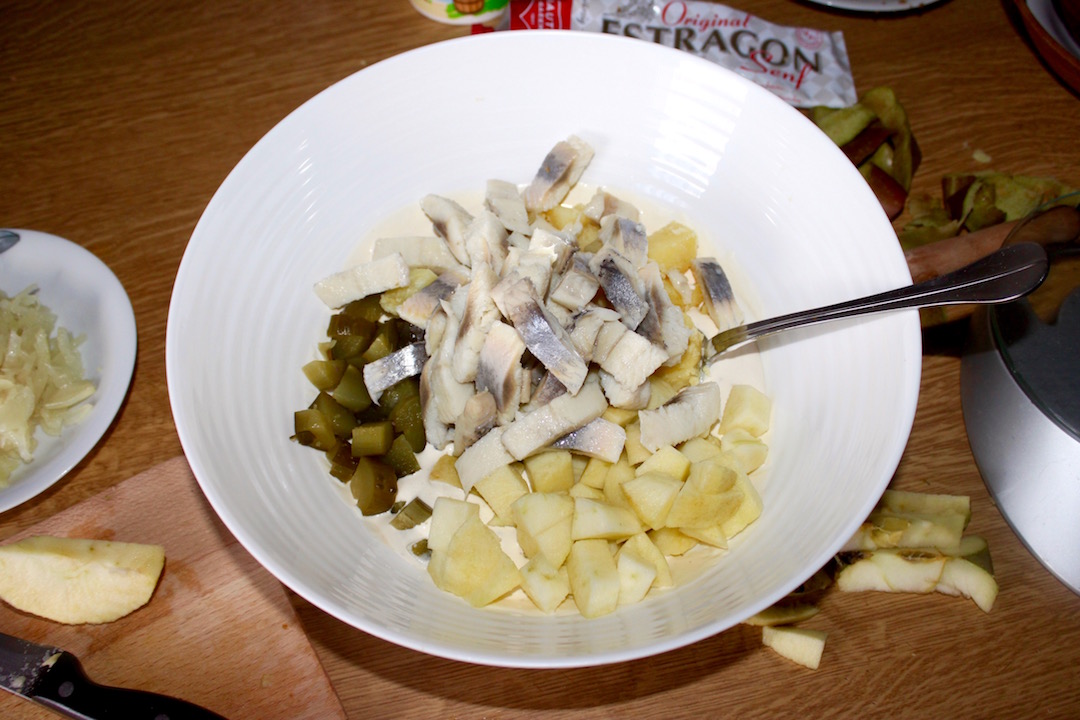 Krojenie składników: Śledzie pokrój w paski o szerokości około 1 cm lub w kostkę (ok. 1,5 cm). Ogórki kiszone i obrane jabłko pokrój w kostkę o zbliżonej wielkości (ok. 1 cm).