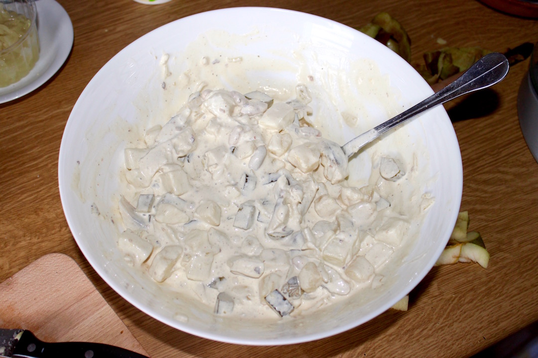 Doprawianie: Całość delikatnie, ale dobrze wymieszaj. Posól i popieprz do smaku (pamiętaj, że śledzie są już słone). Wlej 1-2 łyżki zalewy spod śledzi, aby wzmocnić smak i uzyskać właściwą konsystencję sosu.