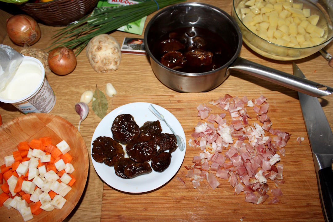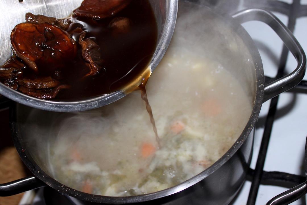 Grzyby: Kilka kapeluszy suszonych grzybów (wcześniej namoczonych i ugotowanych) wraz z wywarem.