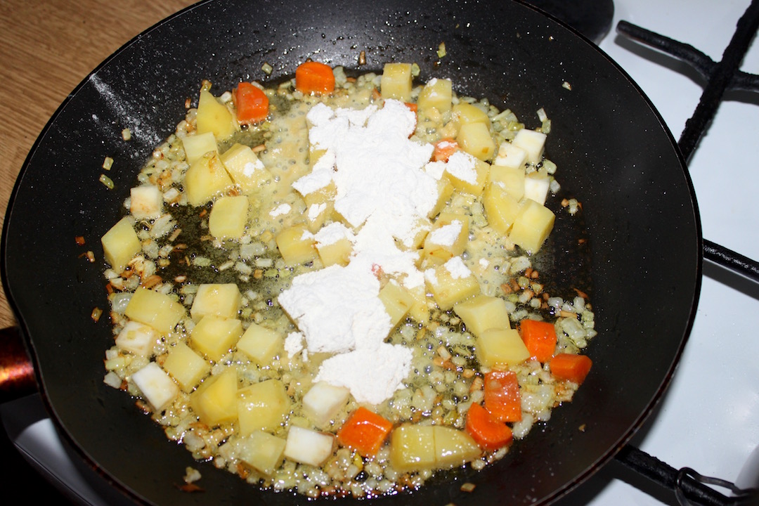 Zasmażka i baza: Na patelni zeszklij cebulę na maśle klarowanym. Dodaj mniejszą porcję warzyw (1/3), chwilę smaż, a następnie wsyp mąkę. Dolej nieco wody i mieszaj, aż powstanie gładka, gęsta zasmażka.