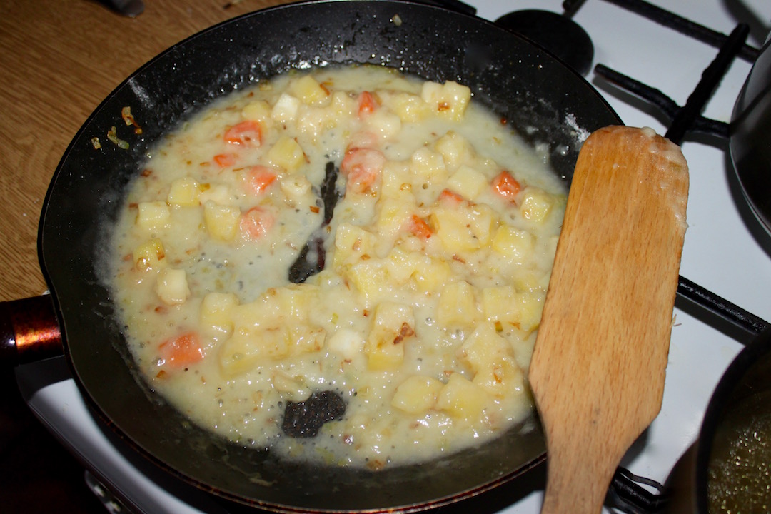 Gotowanie bazy: Zawartość patelni przelej do garnka z połową bulionu. Dodaj majeranek, liść laurowy, kminek, czosnek, sól i pieprz. Gotuj na małym ogniu przez około 10 minut.