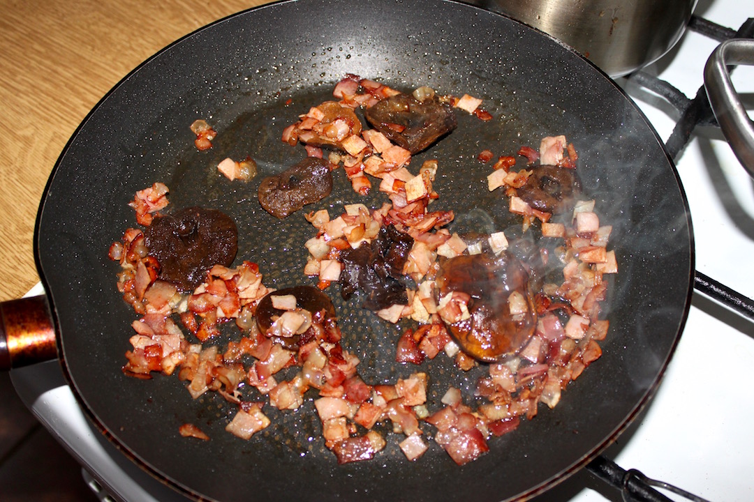 Smażenie dodatków: Na patelni podsmaż posiekaną szynkę oraz ugotowane, pokrojone kapelusze grzybów. Dodaj je do zmiksowanej zupy.