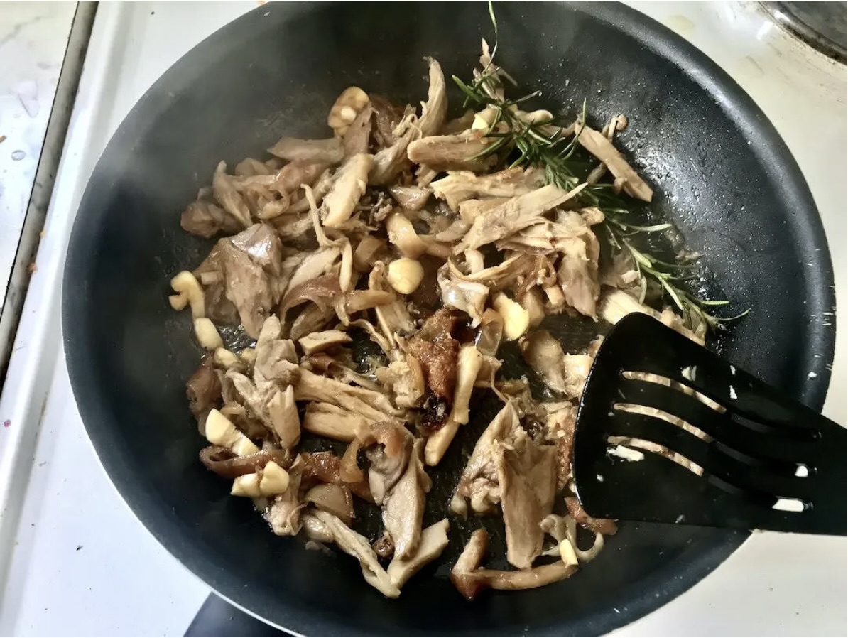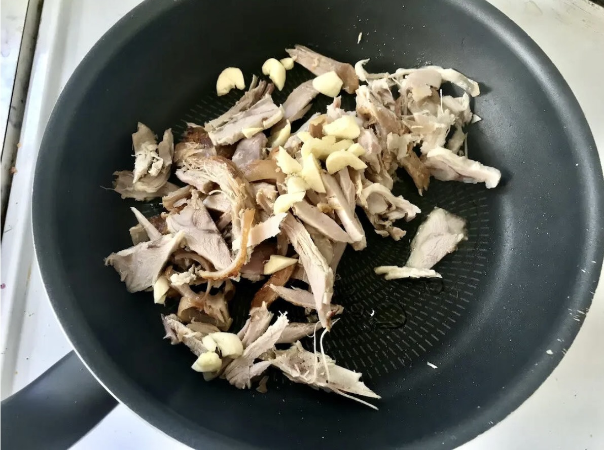 Smażenie: Rozgrzej patelnię i wrzuć na nią szarpaną wieprzowinę.