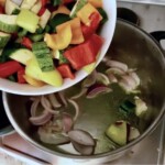Smażenie: W rondelku rozgrzej ok. pół szklanki oliwy. Wrzuć czerwoną cebulę i chwilę podsmaż. Następnie dodaj pozostałe pokrojone warzywa i smaż przez około 2 minuty, często mieszając.
