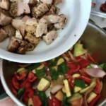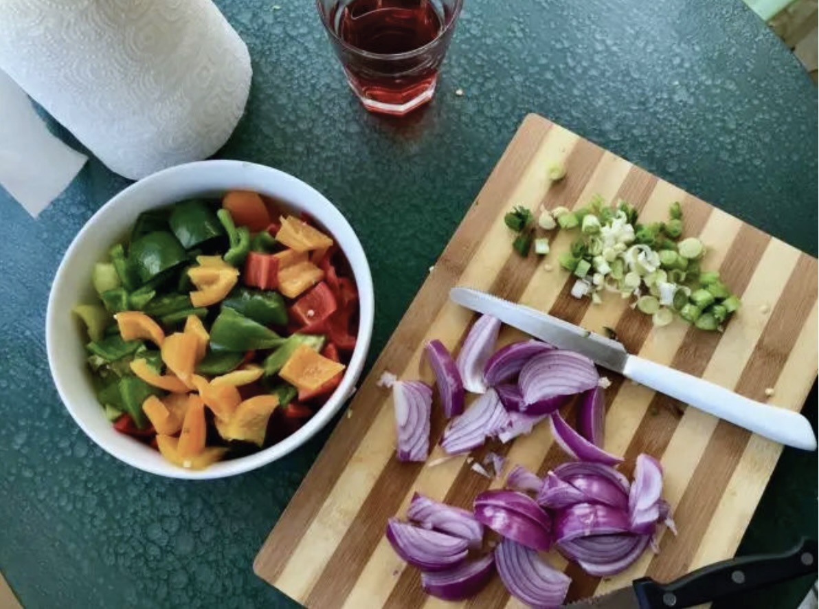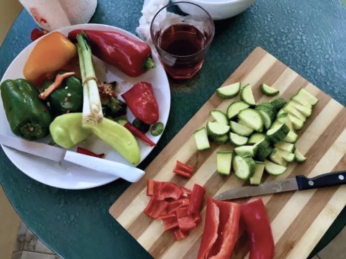Przygotowanie warzyw: Cukinię pokrój w półplasterki, papryki w kostkę, a czerwoną cebulę w grubsze kawałki. Dymkę posiekaj drobno.