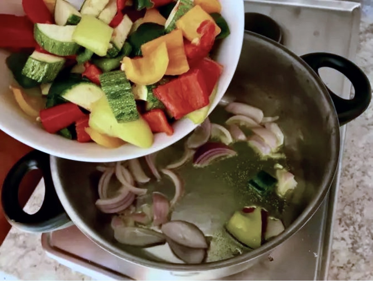 Smażenie: W rondelku rozgrzej ok. pół szklanki oliwy. Wrzuć czerwoną cebulę i chwilę podsmaż. Następnie dodaj pozostałe pokrojone warzywa i smaż przez około 2 minuty, często mieszając.