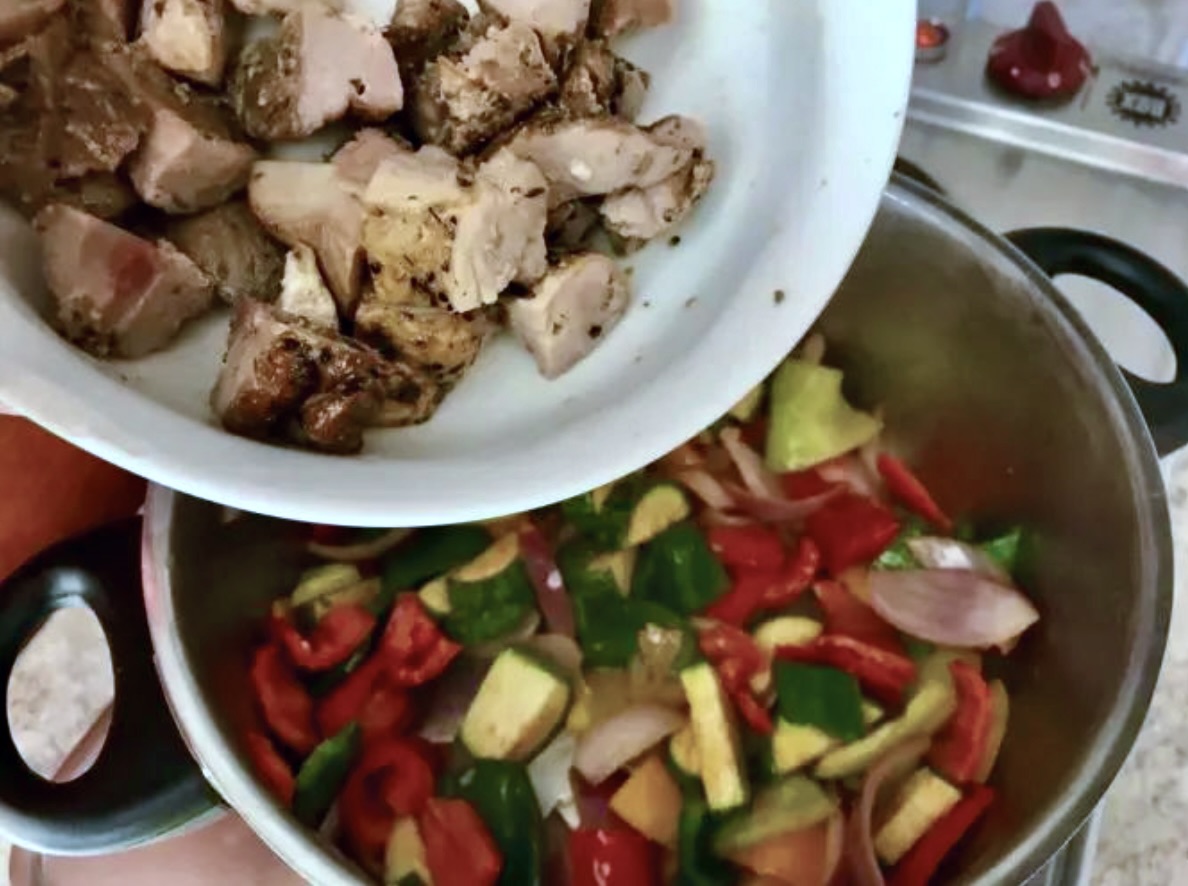 Wieprzowina duszona z dodatkiem całkiem sporej ilości warzyw to przykład na to, że mając pozostały po pieczeniu kawałek mięsa (w tym wypadku schabu wieprzowego) przy odrobinie inwencji można stworzyć pełnowartościowe i pyszne danie. To danie z cyklu „przegląd lodówki”, dlatego traktuj je raczej jako luźną wskazówkę na wykorzystanie zasobów Twojej lodówki. Oczywiście nic nie stoi na przeszkodzie, aby takie danie przygotować świadomie i celowo. Nawet wykorzystując do tego celu surowe mięso wymagające nieco dłuższej obróbki.
