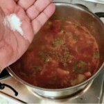 Duszenie: Wlej starte pomidory (lub przecier), dodaj suszone oregano oraz sól. Smaż przez 2 minuty, a następnie dolej trochę wody, aby uzyskać odpowiednią gęstość sosu.