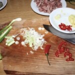 Obierz i zetrzyj imbir. Chilli posiekaj w krążki. Posiekaj białą dymkę.