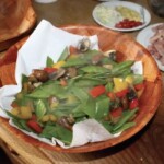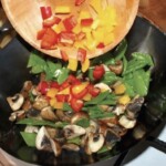 Dodaj blanszowany groszek cukrowy oraz czerwoną i żółtą paprykę. Smaż maksymalnie 2 minuty (muszą pozostać chrupiące).