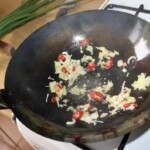Wrzuć zmiażdżony czosnek, starty imbir, czerwoną chilli i białą dymkę. Smaż, mieszając, przez 30 sekund.