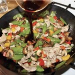 Wrzuć z powrotem na patelnię przesmażone warzywa i mięso. Wymieszaj, a następnie smaż 1 minutę.