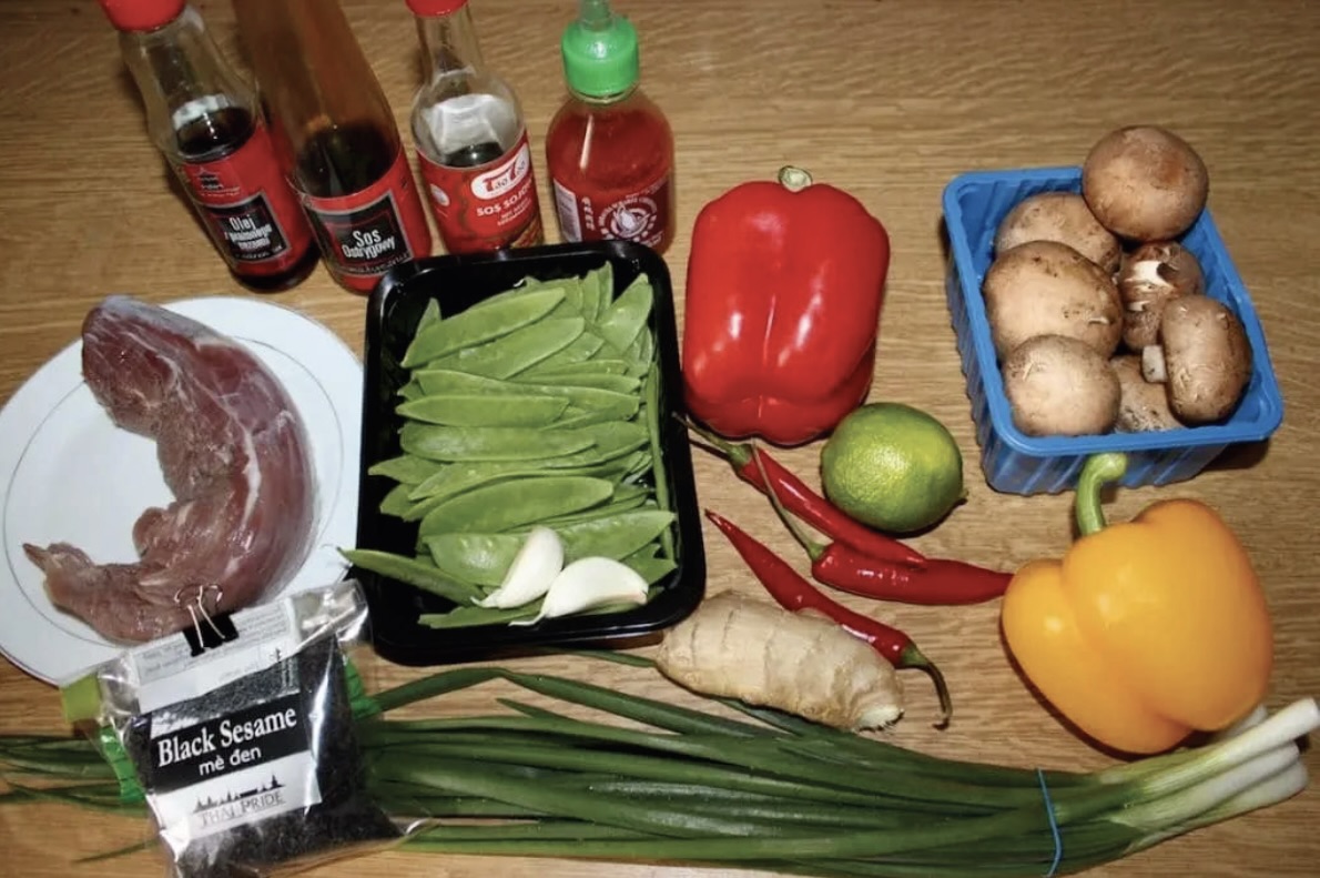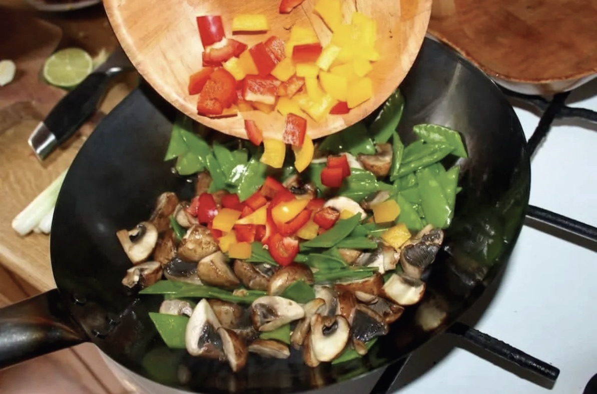 Dodaj blanszowany groszek cukrowy oraz czerwoną i żółtą paprykę. Smaż maksymalnie 2 minuty (muszą pozostać chrupiące).