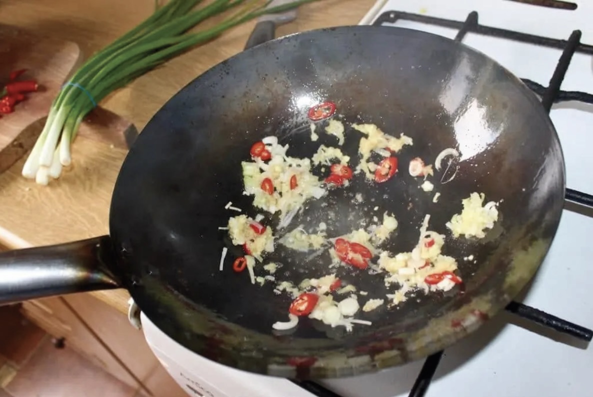 Wrzuć zmiażdżony czosnek, starty imbir, czerwoną chilli i białą dymkę. Smaż, mieszając, przez 30 sekund.