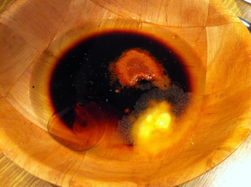 Do miski wlej 2 łyżki sosu sojowego, 1 łyżeczkę oleju sezamowego oraz 1 łyżkę octu ryżowego i wymieszaj.